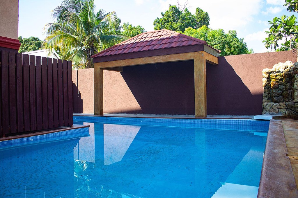 - L-shaped Pool with gazebo and waterfalls